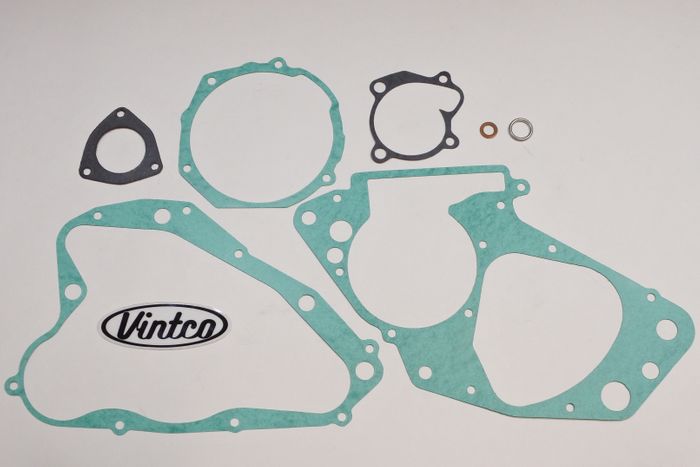 VintCo has all new engine gasket kits to help on your engine lower end rebuild. These gaskets are made with modern materials and manufacturing techniques to ensure an as good or better than OEM fitment and performance. The OEM part numbers are provided as a reference to ensure exact fitment. This kit fits all Suzuki 1984-85 RM125 models. This engine gasket kit includes the Crankcase gasket, clutch cover gasket, magneto cover gasket, exhaust gasket, water pump case gasket, drain plug gasket and water pump drain gasket to complete your build with ease. These newly manufactured gaskets from VintCo will help you keep the ride going!