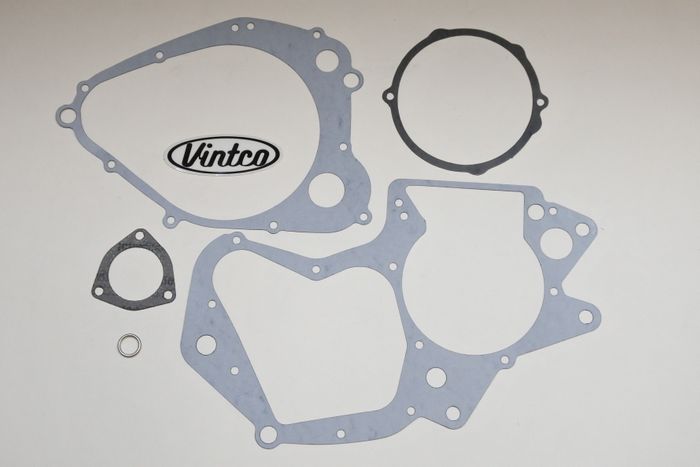 VintCo has all new engine gasket kits to help on your engine lower end rebuild. These gaskets are made with modern materials and manufacturing techniques to ensure an as good or better than OEM fitment and performance. The OEM part numbers are provided as a reference to ensure exact fitment. This kit fits all 1981 RM250 models. This engine gasket kit includes the crankcase gasket, clutch cover gasket, magneto cover gasket, exhaust pipe gasket, and drain plug gasket to complete your build with ease. These newly manufactured gaskets from VintCo will help you keep the ride going!