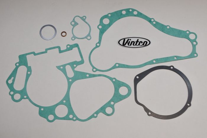 VintCo has all new engine gasket kits to help on your engine lower end rebuild. These gaskets are made with modern materials and manufacturing techniques to ensure an as good or better than OEM fitment and performance. The OEM part numbers are provided as a reference to ensure exact fitment. This kit fits all 1994-95 Suzuki RM250 models. This engine gasket kit includes the crankcase gasket, clutch cover gasket, magneto cover gasket, exhaust gasket, water pump case gasket, and drain plug gasket to complete your build with ease. These newly manufactured gaskets from VintCo will help you keep the ride going!