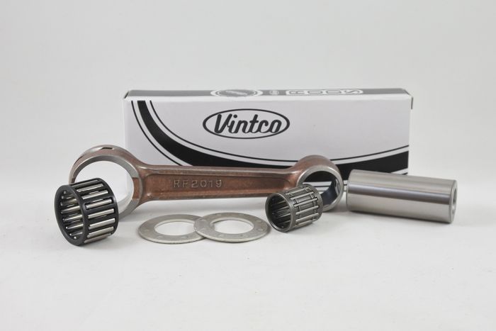 VintCo has all new Heavy Duty Connecting Rod kits for your Kawasaki 1974-76 KX250 & 1975-76 KT250 machines that will get you back on track. These Connecting Rod kits will save you money over a new crankshaft. This connecting rod kit fits all Kawasaki KX250 1974-76/KT250 1975-76. VintCo rods kits are manufactured with Heavy Duty Forged Steel and made with modern materials and manufacturing techniques to ensure an as good or better than OEM fitment and performance. Kit includes a rod, crank pin, big end bearing, wrist pin bearing, and two thrust washers. This newly manufactured connecting rod kit from VintCo will help you keep the ride going!